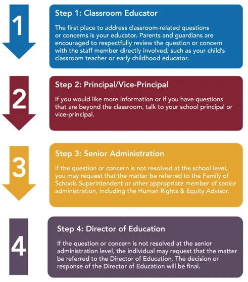 Parents and guardians with questions or concerns about school-based matters should follow the steps below. In most situations, your child’s classroom educator is the first point of contact, followed by your school administration (Principal/Vice-Principal), then your Family of Schools Superintendent of Education, with any outstanding matters being directed to the Director of Education.